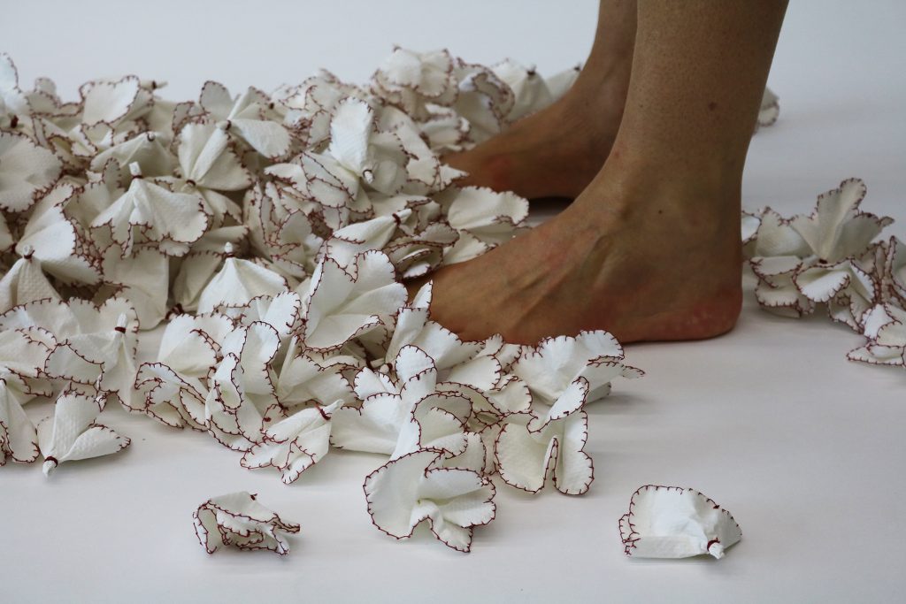Dr Ashworth’s objects-based practice typically has a domestic or what might be called private or intimate quality to it. Her processes in the studio usually feature aspects that come from her Anglo heritage as a woman—in that there is a lot of dedicated, time-consuming, and intimate stitching into things. As she describes it, “I am usually drawn to materials and processes that are typically shunned, discarded, marginalised or usually uninteresting to people, or associated with intimate, domestic, or feminised places or things. They remind me of parts of ourselves and/or our culture that are not talked about or valued.” The connection between her performance and object-based practices is their temporality—either in the subject matter of the work or in the making process. “My interest in time is phenomenological—in that it mimics or encapsulates feminine containment or discipline, and the time and space to be with it—to wrestle with it or to contemplate it.”